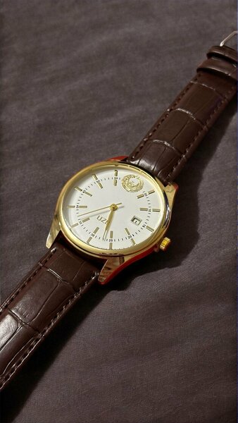 Классические мужские наручные часы с датой Элегантные наручные часы в классическом стиле — идеальный выбор для делового образа и повседневного использования. Золотистый корпус гармонично сочетается с белым циферблатом и коричневым кожаным ремешком, придавая часам статусный и аккуратный внешний вид. Характеристики: • Тип: мужские наручные часы • Механизм: кварцевый • Форма корпуса: круглая • Цвет корпуса: золотистый • Циферблат: белый • Функции: отображение времени, дата • Ремешок: кожаный • Цвет ремешка: коричневый • Стиль: классический, деловой Часы отлично подойдут для офиса, деловых встреч и в качестве подарка.