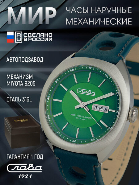 Наручные часы "МИР" от бренда "Слава" - это сочетание высокого качества, функциональности и стильного дизайна. Часы оснащены автоматическим подзаводом, что обеспечивает их автономность и позволяет не беспокоиться о необходимости постоянной подзарядки. Это особенно удобно в путешествиях или при занятиях спортом. Корпус часов выполнен из нержавеющей стали, что гарантирует их долговечность и устойчивость к коррозии. Сапфировое стекло защищает циферблат от царапин и повреждений. Модель имеет зеленый цвет, который подойдет как мужчинам, так и женщинам. Ширина ремешка составляет 22 мм, что обеспечивает комфортное ношение на руке. Часы обладают классом водонепроницаемости WR100, что позволяет носить их в повседневной жизни и при занятиях водными видами спорта. "Слава" - российский бренд, который зарекомендовал себя на рынке как производитель качественных и надежных часов.