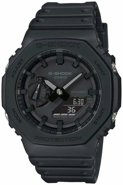 CASlO G-SHOCK GA-2100-1A1 Противоударные кварцевые мужские наручные часы Casio GA-2100-1A1 коллекции G-Shock с цифровой+стрелочной индикацией времени. Тонкий корпус для данной коллекции — 11.8 мм. Калибр механизма — 5611. Максимально допустимая погрешность точности хода +15/-15 секунд в месяц. Корпус усилен углеродным волокном. Функциональность данной модели: формат времени 12/24, вечный календарь до 2099 года, функция летнего времени (DST), мировое время 48 городов (29 часовых поясов), 5 независимых будильников, сигнал начала часа, секундомер с точностью 1/100 секунды и измерением до 23 часов 59 минут 59 cек, таймер обратного отсчёта (диапазон времени 24 часа), диодная подсветка циферблата, функция выключения звука кнопок (Mute), смещение стрелок для удобного просмотра информации на цифровом экране. Водонепроницаемость WR200 (20 атм). Размеры корпуса: (ШxВxТ) 45.4x48.5x11.8 мм.