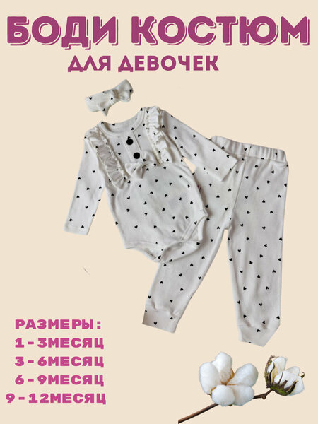 Комплект обеспечивает максимальный комфорт и воздухопроницаемость для нежной кожи ребенка идеально подходит для осеннего сезона, сочетая стильный дизайн и практичность Нарядный комплект "тройка" для новорожденных девочек включает в себя боди, штанишки и ободок, выполненные из рифлёной ткани, состоящей на 100% из хлопка. • Размеры: Комплект доступен в размерах 62, 68, 74 и 80, что позволяет подобрать его для девочек разных возрастов. • Материал: Использование рифлёной хлопковой ткани обеспечивает мягкость и комфорт, что особенно важно для нежной кожи малышей. Хлопок также хорошо пропускает воздух, что делает одежду подходящей для осеннего сезона. • Аксессуары: Ободок, входящий в комплект, завершает образ и делает его более привлекательным для маленьких модниц. Такой комплект идеально подходит для прогулок и праздничных мероприятий, сочетая стиль и удобство.