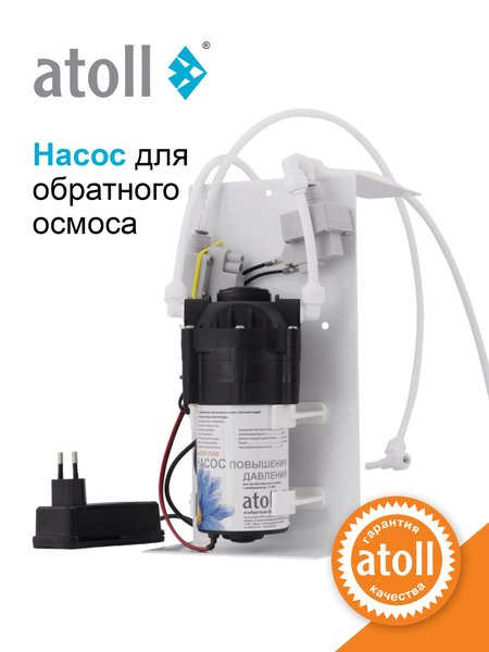 Насос SP-7550 предназначен для бытового использования с системами обратного осмоса atoll A-450, A-550, A-575 для очистки воды, производительностью мембран 50 и 75GPD (галлонов в сутки) при недостаточном давлении в водопроводной воде. Нормальная работа данных систем возможна только при давлении не менее 3 атм.