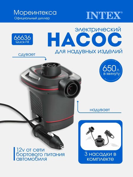 Напряжение питания12В Продуктивность - 650 л/мин. В комплекте: насос-1шт. насадки-переходники-3шт. Вес: 0,7 кг. Размер:13 х14 х 13 см. Производитель: Intex Китай Упаковка: коробка Насос электрический работает от автомобильного прикуривателя 12В В. Используется для надувания издели. Два режима работы - накачивание или откачивание воздуха В комплект входят 3 насадки – переходника под различные виды клапанов.