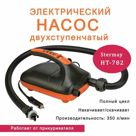 Насос электрический для лодок ПВХ Stermay HT-782 Двухступенчатый электрический насос высокого давления работает от автомобильного прикуривателя. Регулятор давления цифровой в диапазоне 0÷1.36 Bar с шагом 0.035 Bar, производительность 350 л/мин, вес 1.9 кг. Подходит для накачивания/скачивания надувных лодок ПВХ, SUP-досок, РИБов, бассейнов, матрасов, аттракционов. Основные параметры: - Вес: 1.9 кг - Напряжение: 12 В - Сила тока: 10 А - Производительность: 350 л/мин - Время непрерывной работы: 20 мин - Давление воздуха: 0 - 1360 MBR - Величина шага настройки регулятора давления: 0.035 bar - Длина провода: 3 м - Длина шланга: 110 см - Наличие аккумуляторной батареи: нет - Регулятор давления: цифровой - Гарантия: 12 мес Упаковка: - Длина/Ширина/Высота: 27/19/17 см Комплектация: - Шланг с коннекторами: 1 шт - Кольцо уплотнительное: 4 шт (разной толщины) - Руководство пользователя: 1 шт При накачивании сначала крыльчатка нагнетает объем, а затем поршневой компрессор создает рабочее давление. С первой ступени на вторую насос переключается автоматически. Как только давление достигает заданного уровня, срабатывает механический предохранитель – нагнетание воздуха прекращается. Кнопка [PSI/BAR] служит для выбора единиц измерения давления Кнопка [+] служит для увеличения заданного давления Кнопка [-] служит для уменьшения заданного давления Кнопка [(|)] служит для включния/выключения насоса (удержание в течение 3 сек принудительно включает насос на вторую ступень) Время непрерывной работы насоса не более 20 мин. Далее следует дать насосу остыть в течение 30 мин. Корпус из высокопрочного пластика защищает механизмы насоса от повреждений при ударах. Время накачивания лодки средних размеров (3.3 - 3.6 м) составляет 12 минут, скачивания - 10 минут. Насос работает, а вы готовитесь к рыбалке!