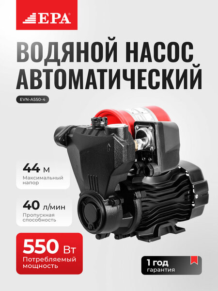 EPA EVN-A550-4 — автоматический насос мощностью 550 Вт, предназначенный для эффективной подачи чистой воды в частных домах, на дачах, в садах и сельскохозяйственных участках. Благодаря встроенной автоматике, насос включается при открытии крана и отключается при прекращении потребления воды, обеспечивая комфорт и экономичное потребление энергии. Подходит для работы с колодцами, баками, ёмкостями, а также для капельного и спринклерного полива. Технические характеристики: Мощность: 550 Вт Напряжение сети: 220 В Тип: Автоматический Применение: Водоснабжение дома, дачи, сада Тип двигателя: Асинхронный Материал корпуса: Уточняется Макс. напор, глубина всасывания, производительность: (при наличии — могу добавить) Преимущества: ✅ Надёжная автоматическая работа ✅ Высокая производительность ✅ Подходит для разных условий водоснабжения ✅ Простое подключение и эксплуатация