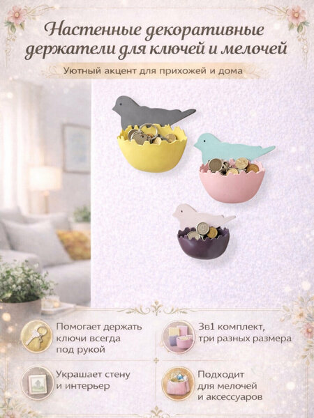 Настенные декоративные держатели 3 в 1 — это удобное и стильное решение для хранения ключей, монет и других мелочей. Комплект включает три держателя разных размеров, которые можно разместить на стене вместе или отдельно, создавая аккуратную и уютную композицию. Прекрасный дизайн в форме птички в «гнезде» добавляет интерьеру тепла и делает пространство более организованным. Отлично подходят для прихожей, коридора, кухни или спальни. Помогают держать важные мелочи всегда под рукой и поддерживать порядок без лишних усилий.
