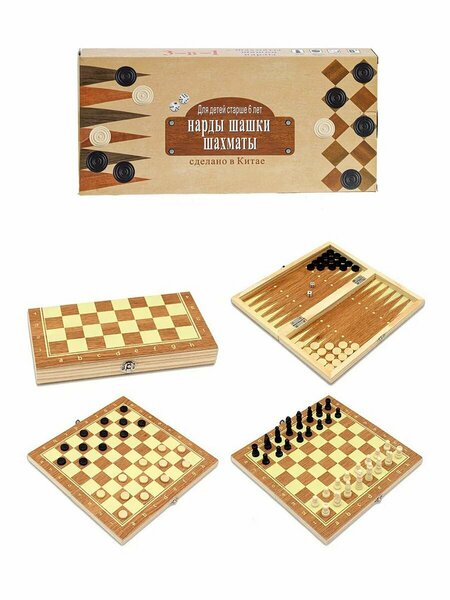Классические настольные игры в виде шахмат, шашек, нард удовлетворят потребности в спокойных развлечениях. Тем более, что их получится приобрести в составе единого набора. В комплекте: игровая складная доска, фигуры шахмат, шашек, кубики. Поле выполнено из древа, фигуры из пластика, размер поля 29х29см.