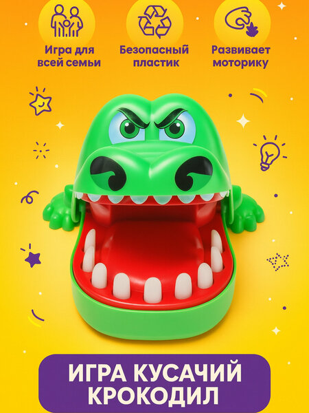 Игра «Крокодил зубы» – веселье для всей семьи! Весёлая настольная игра, где каждый по очереди нажимает на зуб крокодила. Но будь осторожен — если попадёшь на «больной» зуб, крокодил щёлкнет пастью! Преимущества: Развивает внимание и реакцию у детей Безопасная и увлекательная игра Подходит для всей семьи и компании друзей Материал: качественный пластик Возраст: от 3 лет