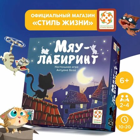 "Мяу-лабиринт" – игра с кошками всех мастей и целым лабиринтом подворотен. Помогите кошкам пробраться через хитросплетения городских улиц и попасть в уютный дом! Поворачивайте и двигайте карточки с дорожками — игра меняется с каждым ходом. Побеждает тот, кто проведёт домой больше кошек! "Мяу-лабиринт" представляет собой тактическую игру, в которой очень важно быть внимательным. Игра великолепно подходит для семейных игр с детьми или в качестве дорожного варианта лабиринта – коробочка очень компактная и лёгкая. Впрочем и для взрослых компаний игра может послужить очень хорошей коллективной головоломкой. Особого упоминания заслуживают иллюстрации бродячих кошек, здесь можно встретить типажи на любой вкус: от романтических натур, играющих на собственном хвосте до темных личностей поджидающих вас в темной переулке с двумя крышками от мусорных баков. В состав настольной игры входит: 26 карточек с подворотнями, 15 бездомных кошек, 2 гостеприимных дома и 5 карточек с правилами.