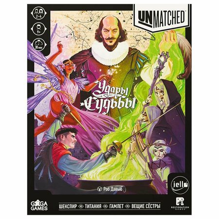 Unmatched — это серия тактических настольных файтингов, в которой самые разные герои сталкиваются в напряжённом сражении. На это раз полем битвы станут театральные подмостки, а оружием — поэзия, магия и безумие! Занавес поднимается. Действующие лица: Уильям Шекспир — выдающийся драматург и поэт. Появлением великого Барда в серии мы обязаны Джонатану Губерману. Его фанатская колода победила в конкурсе от Restoration Games 2020 года и в итоге стала частью официальной игровой серии. Титания — царица фей и эльфов. Могучая чародейка и героиня пьесы «Сон в летнюю ночь». Гамлет — принц датский. Преданный сын и умелый фехтовальщик. Три Ведьмы — три вещие сестры, которые с помощью зелий и колдовства противостоят натиску соперников. Колода ведьм, разработанная Джейсоном Хагером, пришла в серию после достойного второго места в конкурсе от Restoration Games. Возраст: от 9 лет Кол-во игроков: от 2 до 4 Длительность партии: 20-40 мин Язык: Русский Рейтинг BGG: 8.4