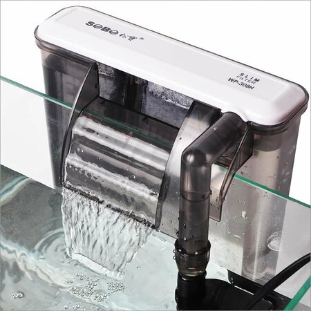 Основное достоинство такого устройства состоит в том, что этот фильтр не занимает место внутри аквариума, то есть для аквариумов (до 70 л) это настоящая находка. Из-за того, что рюкзачок не погружается в воду, чистить его гораздо удобнее, чем фильтры, которые расположены внутри аквариумов. Руки не приходится окунать в воду, рыбки не пугаются. Более того, руками можно даже занести инфекцию, а при использовании рюкзачка эти риски сводятся к минимуму. Модель WP-408Н оснащены функцией регулировки потока, что также является важным достоинством такого типа фильтра. Принцип действия Забор воды из аквариума происходит по патрубку, который расположен с внутренней стороны аквариума. Внутри фильтра вода очищается с помощью хлопкового картриджа с наполнителем (гранулированный уголь). Отфильтрованная вода поступает обратно в аквариум в виде своеобразного водопада, который перемешивает воду внутри аквариума и обогащает её кислородом. Производительность помпы — 600л/ч. Мощность помпы — 6Вт