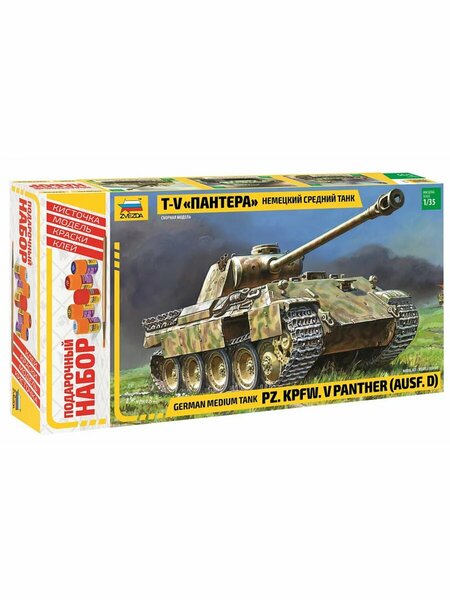 Масштаб 1:35 Детали х 482 Размер, см 24.7 Сборная модель - Немецкий средний танк Т-V "Пантера". Историческая справка: Эта боевая машина была разработана немецкой фирмой MAN в 1941-42 годах в качестве основного танка вермахта. Боевым дебютом «Пантер» стала битва на Курской дуге. «Пантера» считается лучшим немецким танком Второй Мировой войны. Противостоять снарядам «Пантеры» могла лишь броня советских тяжёлых танков ИС-2. В комплектацию данного набора входит: сборная модель клей набор красок для покраски кисточка Подходит для подарка как начинающему моделисту, так и моделисту с опытом. Внимание! В подарочный набор входят только основные краски. В набор входят краски: АКР-08 вороненая сталь 08/рзл.(5мл) АКР-18 желто-оливк. нем.18/рзл.(5мл) АКР-20 черная 20/рзл.(5мл) АКР-35 зеленая 35/рзл.(5мл)