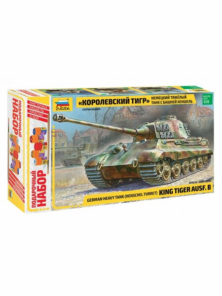 Масштаб 1:35 Детали х 423 Размер, см 29.5 Сборная модель - Тяжелый немецкий танк T-VIB «Королевский Тигр» с башней Хеншель Историческая справка: «Королевский тигр» был самым тяжёлым серийным танком Второй мировой войны. Своим мощнейшим 88-мм длинноствольным орудием он был способен уничтожить танк «Шерман» с расстояния 3500 метров. На фронт «Королевские тигры» начали поступать в феврале 1944 года, уже в мае того же года они впервые были применены в боях под Минском. Две роты, вооружённые этими грозными машинами, участвовали в обороне Нормандии во время высадки Союзных войск. «Королевский тигр», управляемый опытным экипажем, являлся опаснейшим противником для всех танков. Набор деталей из пластмассы для сборки одной модели танка. Модель собирается при помощи специального клея, выпускаемого предприятием «Звезда». Состав набора: отливки инструкция по сборке декаль Внимание! В подарочный набор входят только основные краски. В набор входят краски: АКР-08 вороненая сталь 08/рзл.(5мл) АКР-10 ржавчина 10/рзл.(5мл) АКР-18 желто-оливк. нем.18/рзл.(5мл) АКР-55 защитная 55/рзл.(5мл)