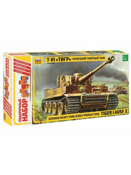 Масштаб 1:35 Детали х 335 Размер, см 24,1 Сборная модель - Немецкий тяжелый танк Т-VI "Тигр". Историческая справка: Panzerkampfwagen VI Ausf. H1, «Тигр» — немецкий тяжёлый танк времён Второй мировой войны, прототипом которого являлся танк VK4501 (H), разработанный в 1942 году фирмой «Хеншель» под руководством Эрвина Адерса. Наряду с прототипом фирмы «Хеншель» руководству Рейха был представлен и проект Фердинанда Порше — VK4501 (P), но выбор военной комиссии пал на вариант «Хеншель», хотя Гитлер более благоволил к изделию Порше. Впервые танки «Тигр» пошли в бой 29 августа 1942 года у станции Мга под Ленинградом, массированно начали применяться со сражения и взятия Харькова в феврале — марте 1943 года, использовались вермахтом и войсками СС вплоть до окончания Второй мировой войны. Модель создавалась при участии ведущих экспертов и с использованием новейших технологий. Применено уникальное решение для гусениц – они сочетают в себе высочайшую детализацию и легкость сборки. Модель по качеству не уступает лучшим мировым аналогам, но значительно привлекательнее по цене. В комплектацию данного набора входит: сборная модель клей набор красок для покраски кисточка. Подходит для подарка как начинающему моделисту, так и моделисту с опытом. Внимание! В подарочный набор входят только основные краски. В набор входят краски: АКР-20 черная 20/рзл.(5мл) АКР-08 вороненая сталь 08/рзл.(5мл) АКР-18 желто-оливк. нем.18/рзл.(5мл) АКР-25 древесная 25/рзл.(5мл)