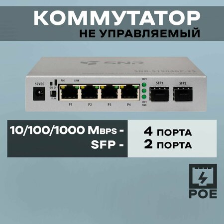 SNR-S1904GP-2S — предназначен для создания надёжной и эффективной сетевой инфраструктуры. Благодаря наличию интерфейсов SFP и металлическому корпусу, этот неуправляемый коммутатор обеспечивает стабильное подключение и защиту от физических воздействий. Основные преимущества SNR-S1904GP-2S:4 порта 10/100/1000Base-T с поддержкой PoE 802.3af/at и суммарной мощностью PoE 65 Вт для подключения абонентских линий;2 порта 1000Base-X SFP для подключения к волоконно-оптической сети; функционал изоляции портов для обеспечения безопасности и стабильности работы сети; металлический корпус для защиты от механических повреждений и электромагнитных помех. SNR-S1904GP-2S — отличный выбор для малых и средних предприятий, офисов, а также для домашнего использования.