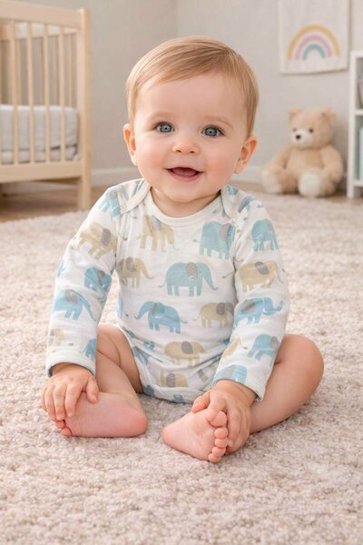 Нежное боди для вашего малыша Детское боди с длинным рукавом — удобная и практичная базовая модель для малышей. Изделие выполнено из мягкого хлопкового трикотажа, приятного к телу и безопасного для чувствительной детской кожи. Светлая расцветка с нежным принтом делает модель универсальной для повседневной носки. Основные характеристики: • Тип изделия: боди детское • Пол: для мальчиков • Рукав: длинный • Горловина: расширенная (конверт), удобна для надевания через голову • Застёжка: кнопки между ножек для быстрой смены подгузника • Материал: хлопок (мягкий трикотаж) • Ткань: дышащая, гипоаллергенная, комфортная • Сезон: всесезонное (подходит для дома и прогулок) • Производство: Китай Преимущества модели: ✔ Натуральный материал, приятный к коже ✔ Не сковывает движения малыша ✔ Удобный крой для активных детей ✔ Качественные швы без грубых обработок ✔ Практичные кнопки для лёгкого переодевания ✔ Подходит для ежедневной носки Уход за изделием: • Стирка при 30–40°C • Деликатный режим • Не отбеливать • Гладить при средней температуре Боди отлично сочетается с ползунками, штанишками и комбинезонами. Идеальный вариант для повседневного гардероба малыша.