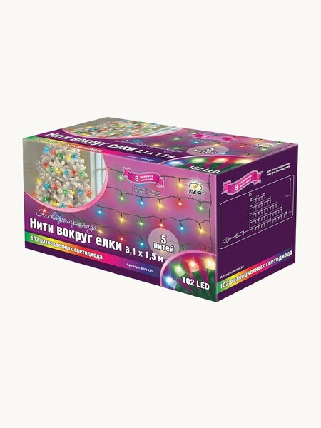 Электрогирлянда B&H модели Нити BH0435 предназначена для создания праздничной атмосферы в вашем доме. Она оснащена 102 разноцветными лампочками, которые красиво сверкают и создают яркое свечение. Длина гирлянды составляет 3.1 метра, а высота — 1.5 метра. Провод выполнен в черном цвете и имеет длину 150 см, что делает его практически незаметным на фоне темно-зеленых иголок елки.