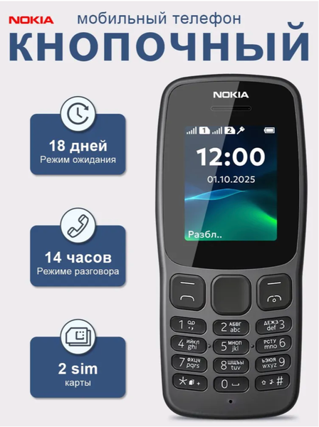Nokia надежный классический мобильный телефон, созданный для тех, кто ценит простоту, выносливость и долгую автономную работу. Благодаря мощному аккумулятору на 800 мА·ч, телефон способен работать до 18 дней в режиме ожидания и до 14 часов в режиме разговора, что делает его идеальным спутником в походах, на рыбалке, в поездках или при работе вдали от розетки. Телефон оснащён цветным 1.8-дюймовым TFT-дисплеем, поддерживает две SIM-карты (попеременная работа), имеет крупные удобные клавиши и яркий фонарик, что особенно полезно на природе и в тёмное время суток. Прочный пластиковый корпус защищает устройство от ударов и царапин, а компактные размеры (111.2 × 49.5 × 14.4 мм) и лёгкий вес (всего 67 г) позволяют всегда держать его под рукой. Встроенные функции — FM-радио, калькулятор, календарь, будильник и часы — обеспечивают всё необходимое для повседневного использования. Поддержка полифонии и вибровызова делает общение комфортным, а microUSB-разъём позволяет легко заряжать устройство.