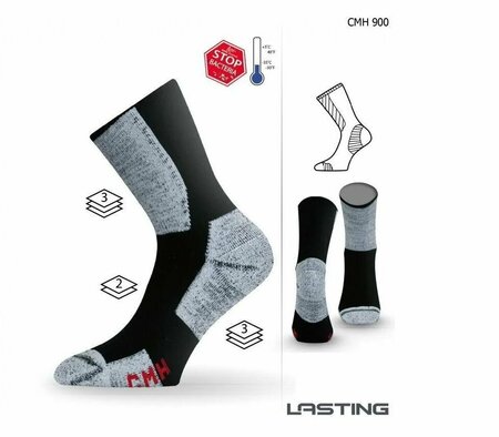 Lasting CMH - плотные теплые носки, изготовленные из двуслойного плюша и полипропиленовых ниток, содержащих ионы серебра, которые сокращают рост бактерий и грибков, уменьшают неприятные запахи и поддерживают нормальный баланс кожи. Носки обеспечивают высокий уровень теплоизоляции и защищают от натирания мозолей. Дополнительные зоны защиты расположены вокруг голени и щиколотки. Зоны носка и пятки оснащены гладким трехслойным плюшем, который обеспечивает комфорт во время ходьбы, а также укрепление зон, подверженных наибольшей нагрузке. Лучше всего подойдут для ношения в холодный сезон (осень, зима). Назначение: треккинг, ежедневное использование, зимние виды спорта Особенности: