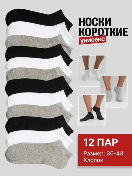 Набор унисекс носков укороченных – это идеальный выбор для активного образа жизни. Подходят для девушек, мужчин и подростков. В наборе 12 пар носков классических цветов. - чёрных - белых - серых Универсальный размер подойдет на ногу 36-42 ✅ Натуральный состав. Носки укороченные изготовлены из высококачественного хлопка, обеспечивая комфорт и удобство в ношении. За счет натурального хлопка в составе, носки отлично пропускают воздух и впитывают влагу. ✅ Мягкая резинка и швы, которые не натирают. Мягкая резинка обеспечивает надежную посадку, не давит и не вызывает дискомфорта. ✅ Низкий фасон носков подходит для повседневной носки, занятий спортом и фитнесом. Короткие носки с удобной эластичной резинкой, которая не дает носкам спадать и не сдавливает ногу. Носки выполнены из хлопка с добавлением синтетических волокон для лучшей посадки по ноге. Мягкая и приятная к телу ткань. Белые носки — это классика, которая всегда в моде и легко сочетается с любой одеждой. Наш набор носков идеально подходит для всех: будь то мужские или женские носки, они одинаково хорошо сидят и на мальчиках, и на девочках. Эти короткие носки станут отличным выбором для повседневной носки, занятий спортом или отдыха. В наборе вы найдете носки, которые подойдут для любого случая, будь то мужские или женские образы.