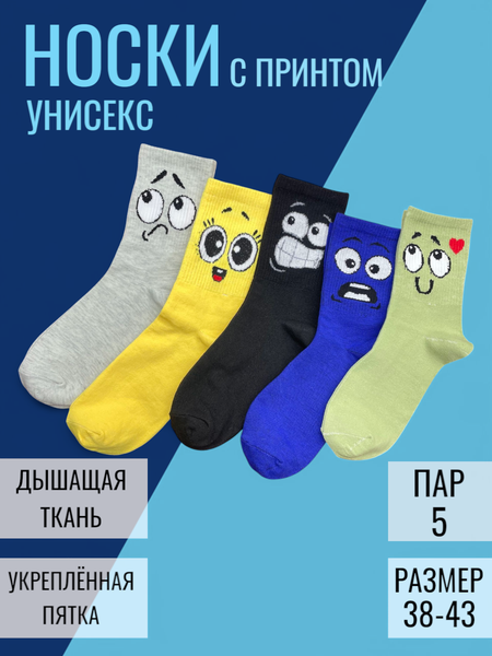 Носки унисекс с принтами смайлов - это не просто элемент гардероба, а способ выразить своё настроение без слов. Каждая пара украшена яркими и разнообразными смайликами, от радости и удивления до грусти и сарказма. Они поднимают настроение не только вам, но и окружающим, делая каждый день ярче и позитивнее. Носки унисекс подходят для женщин и мужчин, благодаря чему они могут стать отличным подарком для тех, кто ценит комфорт и не боится быть собой. Состав материала включает в себя 80% поливискозы и 20% эластана, что делает носки мягкими, дышащими и удобными для занятий спортом. Носки унисекс с принтами смайлов представлены в различных цветах, включая синий, зеленый, желтый, серый, черный, белый. Особенностью этих носков является усиленная пятка, что обеспечивает дополнительную прочность и долговечность. В упаковке вы найдете одну пару носков, каждая из которых имеет размер 36-43, что позволяет выбрать подходящий размер для себя. Выбирая носки унисекс с принтами смайлов, вы получаете не просто удобную и практичную вещь, но и возможность выразить свою индивидуальность и настроение.