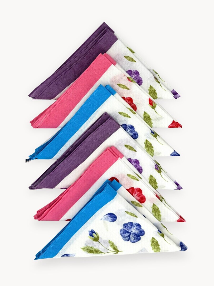 Достоинства:хорошие платочки, хорошо прошиты, приятная и при этом не тонкая ткань. не батист, конечно, но на ощуп приятна. разноцветные цветочки: два красных платка, два фиолетовых и т.д. Недостатки:большие, на мой взгляд, очень толстый край Комментарий:хорошие платки