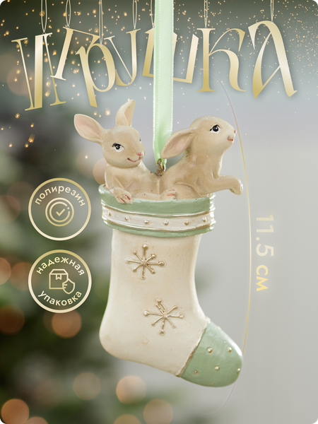 Елочная игрушка Лавка Чудес "Кролик в носке", полирезин, 11,5 см, цвет белый/зеленый/коричневый