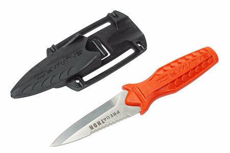 Нож Salvimar Predathor это очень компактный нож. Общая длина ножа, включая футляр всего 16 см. Этот нож прекрасно подойдет для подводной охоты и фридайвинга. Лезвие ножа Salvimar Predathor выполнено из высокопрочной нержавеющей стали 420. Одна сторона имеет гладкую заточку, вторая оснащена стропорезом (Серейторной заточкой). Ножны оснащены системой быстрого вытаскивания ножа. Это реально самая быстрая и удобная система вытаскивания ножа - нужно просто потянуть за рукоять от себя и затем вверх или вниз, в зависимости от расположения ножа. А ведь это пожалуй самый важный плюс, ведь это техника безопасности. От ножа и скорости его доставания, может зависеть Ваше здоровье. Ремешок для крепления ножа на ногу или руку не идет в комплекте с ножом. И если он Вам необходим то его нужно приобрести отдельно.