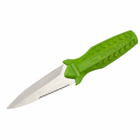 Нож Salvimar Predathor это очень компактный нож. Общая длина ножа, включая футляр всего 16 см. Этот нож прекрасно подойдет для подводной охоты и фридайвинга. Лезвие ножа Salvimar Predathor выполнено из высокопрочной нержавеющей стали 420. Одна сторона имеет гладкую заточку, вторая оснащена стропорезом (Серейторной заточкой). Ножны оснащены системой быстрого вытаскивания ножа. Это реально самая быстрая и удобная система вытаскивания ножа - нужно просто потянуть за рукоять от себя и затем вверх или вниз, в зависимости от расположения ножа. А ведь это пожалуй самый важный плюс, ведь это техника безопасности. От ножа и скорости его доставания, может зависеть Ваше здоровье. Ремешок для крепления ножа на ногу или руку не идет в комплекте с ножом. И если он Вам необходим то его нужно приобрести отдельно.