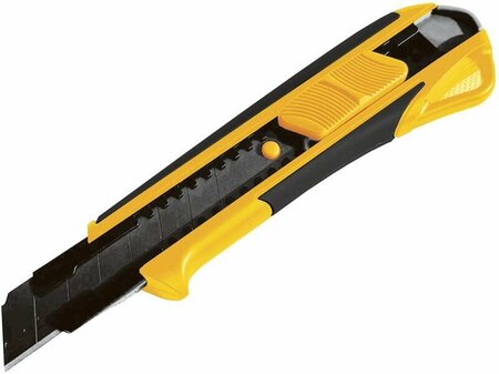 B 18 мм Усиленный. Для разрезания бумаги, кожи, резины, гипсокартона, ткани, ковровых покрытий, линолеума и др. материалов при проведении строительных работ. Автоматическая кнопка выдвижения и фиксации лезвия. Усилен металлической направляющей. Снабжен специальным отверстием для обламывания сегментов лезвия. Удобный отсек для хранения лезвия. Материал: корпус из ABS пластика со вставками из TPR резины, закаленное сегментное черное лезвие из SK-5 стали с двойной заточкой.