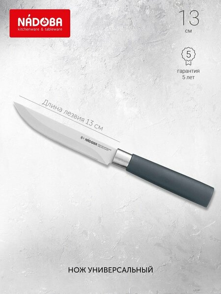 Универсальный нож NADOBA Haruto – многофункциональный кухонный инструмент, который подходит для повседневных забот на кухне, для нарезки продуктов и разделывания некрупной рыбы. Лезвие металлического ножа длиной 13 см выполнено из высококачественной нержавеющей стали, за счет пятигранного профиля клинок отличается высокой прочностью режущей кромки, качественным резом и простотой заточки. Толщина лезвия у обуха составляет 1,6 мм, что обеспечивает высокую прочность, хороший баланс, удобство и безопасность работы с ножами. Эргономичная ручка ножика с гладкой поверхностью удобно лежит в руке во время использования, не скользит и легко моется. Материал ручки универсального ножа – специальный высококачественный пластик, устойчивый к механическим воздействиям. Ножи для кухни NADOBA можно мыть как вручную, так и в посудомоечной машине. Товары для дома и кухни и кухонные принадлежности можно преподносить в качестве подарков на праздники и торжества, в том числе на новоселья. Гарантия – 5 лет.