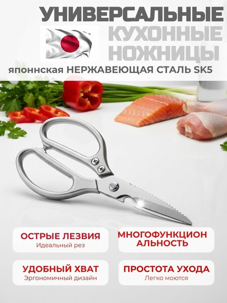 Универсальные кухонные ножницы из нержавеющей стали с эргономичными противоскользящими ручками, лезвиями из японской стали SK5. Подходят для разделки птицы, рыбы, овощей на вашей кухне и для использования в саду. Они справятся с множеством задач в вашем доме. Они помогут очистить и разделать рыбу, разделать птицу и открыть бутылку. Кухонные ножницы SK5 прочный и надежный инструмент в вашем доме. Ножницы оснащены эргономичными и противоскользящими ручками с насечками, которые обеспечивают надежный захват инструмента во время работы и предотвращают его выскальзывание из рук. Они также удобны для творчества и обрезки картона и бумаги. Не требуют заточки перед применением и имеют регулируемое крепление — если вам покажется, что они тугие, можно ослабить фиксирующую гайку. Не требуют сложного ухода, их можно помыть под краном или в посудомоечной машине и протереть насухо мягкой салфеткой или бумажным полотенцем. Выполнены по японской технологии и из японской стали.