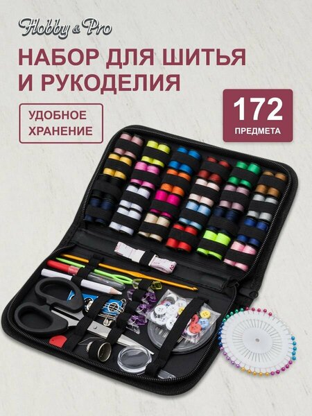 Компактный набор от Hobby&Pro пригодится всем, кто занимается шитьем, рукоделием, мелким ремонтом одежды. Содержимое набора находится в удобном чехле на молнии, который оснащён одним просторным отделением. Эта модель обладает хорошей вместимостью и предназначена для хранения 172 предметов. Надёжные резинки, закреплённые внутри основного отделения, прочно удерживают швейные принадлежности, способствуют поддержанию порядка и позволяют легко просматривать содержимое. С помощью комплектующих из этого набора вы сможете: – соединять детали кроя перед наметкой или наложением строчки; – снимать мерки с помощью сантиметровой ленты; – делать мелкий ремонт и штопку вещей. – при необходимости быстро заменить пуговицы или кнопки. Состав набора: ● 48 мини-катушек швейных ниток ассорти ● Набор игл для ручного шитья в распределительном пенале ● Булавки портновские ● Булавки английские ● Кнопки пришивные ● Пуговицы ● Прищепки для ткани ● Ножницы канцелярские ● Крючок для вязания ● Карандаш для ткани ● Вспарыватель ● Игла для сшивания вязаных изделий ● Сантиметровая лента ● Нитевдеватель ● Напёрсток ● Лупа ● Футляр на молнии'. Размер: 21х14х3,5 см.