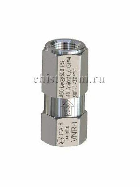 VNR - I Обратный клапан высокого давления из нержавеющей стали, материал уплотнения Viton, пропускает поток только в одном направлении, применяется в магистралях высокого давления. Номинальное давление: 400 бар Допустимое давление: 450 бар Температура: 90°C 25 л/мин, 1/4 г. 450 бар