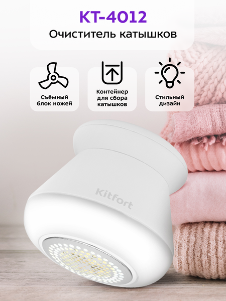 Очиститель катышков Kitfort КТ-4012 вернёт вашей одежде ухоженный вид! Неправильная стирка, износ или примеси полиэстера в тканях приводят к появлению катышек, из-за которых любимые вещи теряют свой первоначальный вид. Очиститель катышков КТ-4012 можно использовать для ухода за любыми тканями из хлопка, шерсти или льна. Принцип работы прибора схож с электробритвой – защищённый металлической сеточкой блок ножей срезает комки ворса с поверхности ткани. Управление прибором осуществляется с помощью всего лишь одной кнопки. Когда вы нажимаете на кнопку включения, загорается подсветка, благодаря которой можно лучше очистить ткань и не пропустить очень маленькие катышки. Прибор работает от встроенного аккумулятора. Заряжать очиститель катышков с помощью USB-шнура Type-C можно от компьютера или через переходник от розетки, который наверняка окажется у вас дома. Комки ворса попадают в контейнер, который нужно периодически очищать. Перед чисткой необходимо выключить прибор, открутить контейнер для сбора катышков и высыпать содержимое прибора. Также контейнер можно помыть водой. Все детали КТ-4012 легко разбираются, что удобно при чистке прибора. Съёмный блок ножей закрыт защитной металлической сеткой. Контейнер для сбора катышков легко снимается и чистится. Кроме того, в комплекте с прибором идёт щёточка для чистки ножей. Очиститель катышков можно брать с собой в путешествия или на работу – он с лёгкостью поместится в небольшой сумке. Сам прибор небольшой и лёгкий по весу.