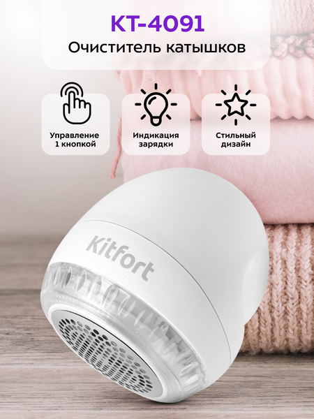 Очищаю всё на своём пути! Очиститель катышков Kitfort КТ-4091 вернёт вашей одежде ухоженный вид, счистив с неё появившиеся катышки. Катышки появляются на одежде из-за неправильного ухода, частой стирки, износа или из-за примеси полиэстера в тканях на одежде. Очиститель катышков КТ-4091 можно использовать для ухода за любыми тканями из хлопка, шерсти или льна. Принцип работы прибора схож с электробритвой – защищённый металлической сеточкой блок ножей срезает комки ворса с поверхности ткани. Управление прибором осуществляется всего лишь одной кнопкой. После включения у устройства начнут вращаться ножи, а на корпусе загорится зелёным индикатор работы. После очистки катышков повторным нажатием выключите прибор. Комки ворса попадают в контейнер, который нужно периодически очищать. Перед чисткой необходимо выключить прибор, открутить контейнер для сбора катышков и высыпать содержимое прибора. Также контейнер можно помыть водой. Все детали КТ-4091 легко разбираются, что удобно при чистке прибора. Съёмный блок ножей закрыт защитной металлической сеткой. Контейнер для сбора катышков легко снимается и чистится. Кроме того, в комплекте с прибором идёт щёточка для чистки ножей. Прибор работает от встроенного аккумулятора. Заряжать очиститель катышков с помощью USB-шнура Type-C можно от компьютера или через переходник от розетки, который наверняка окажется у вас дома. Обычное время зарядки составляет примерно 3,5-4 часа. Прибор небольшой и лёгкий по весу. Компактные размеры устройства избавляют от проблемы хранения и транспортировки устройства. Крышка защищает сетку от загрязнений. Очиститель катышков КТ-4091 имеет минималистичный стильный дизайн. Вырезы на корпусе прибора делают внешний вид КТ-4091 стильным и оригинальным. В комплекте идёт щёточка, которая предназначена для очистки ножей, сумка для хранения и переноски устройства.