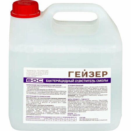 Предназначение: Для фильтра . Подходящие модели: Гейзер . Объем: 3 л. Макс. рабочая температура: +40 °C Описание: Бактерицидный очиститель смолы Гейзер предназначен для борьбы с бактериальным загрязнением смолы. Очиститель добавляется в солевой раствор для фильтров с ручным управлением или в специальный дозатор, установленный в солевых баках фильтров имеющих автоматическое управление. При концентрации в воде содержания железа более 10 мг/л, рекомендуется постоянное дозирование бактерицидного очистителя смолы с помощью специального реагентного фидера. Приобретайте очиститель от производителя Гейзер в нашем интернет-магазине для эффективной очистки фильтров с ионообменной загрузкой, где высокая концентрация железа.