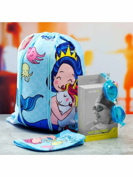 Детский набор для плавания Русалка. Детский набор для плавания включает в себя шапочку для бассейна , очки для плавания, мешочек. Для посещения любого бассейна одним из обязательных атрибутов является шапка для плавания. Это не только необходимая но и очень полезная вещь. Она защищает волосы от вредного воздействия хлорки, не дает воде проникать в уши, сохраняет тепло. Несомненное преимущество шапочки в том, что она помогает вам добиваться максимальных результатов: волосы не мешают во время плавания, уменьшается сопротивление воды. Размер шапочки для плавания универсальный 46-52 см. Детские очки для плавания - это незаменимый аксессуар для плавания в водоёме и тренировок в бассейне. Весь набор для плавания выполнен в ярком дизайне, который обязательно порадует вашего ребенка. Долговечные материалы. Удобный мешочек для хранения спортивных принадлежностей в наборе.