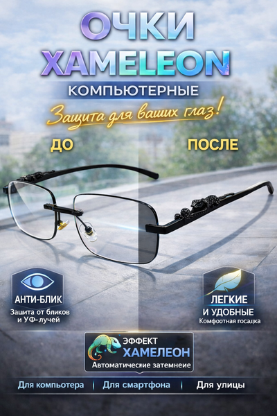 Компьютерные очки с эффектом хамелеон автоматически затемняются при ярком свете и остаются прозрачными в помещении. Снижают нагрузку на глаза при работе за компьютером, телефоном и ноутбуком.