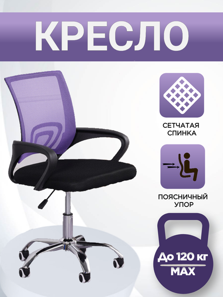 Офисное кресло на колесах: максимальная нагрузка 120 кг Офисное кресло на колесах с максимальной нагрузкой 120 кг предназначено для обеспечения комфорта и поддержки во время работы или отдыха. Регулируемая высота сиденья Кресло оснащено функцией регулировки высоты сиденья, что позволяет настроить его под индивидуальные параметры пользователя. Высота сиденья составляет 40 см, а глубина и ширина сиденья – 53 см и 46 см соответственно. Материал обивки и цвет Обивка кресла выполнена из сетки и текстиля, что обеспечивает воздухопроницаемость и комфорт при длительном использовании. Цвет товара – фиолетовый, что придает креслу стильный и современный вид. Кресло оборудовано колесами (роликами) с прорезиненным покрытием, что обеспечивает плавное и бесшумное перемещение по различным поверхностям. Наличие подлокотников и поясничного упора обеспечивает дополнительную поддержку и комфорт во время использования. В комплект кресла входят: сидение – 1 шт, спинка – 1 шт, подлокотники – 2 шт, пятилучие (крестовина) – 1 шт, ролики – 5 шт, газлифт – 1 шт, пиастра – 1 шт, инструкция – 1 шт.