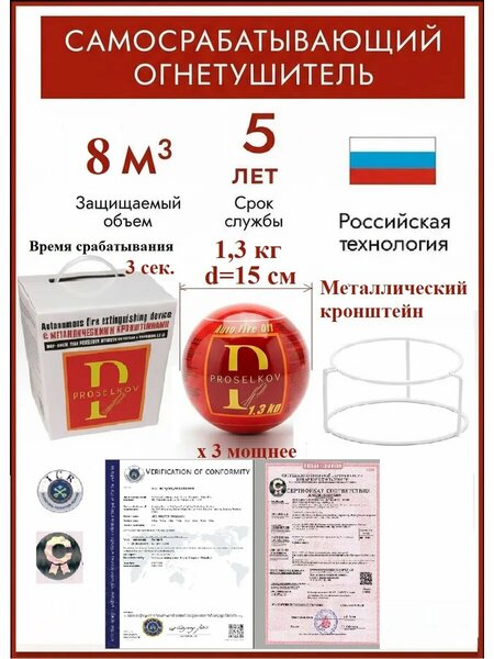 Шар-Сфера для пожаротушения A, B, C, E класса пожара Premium PROSELKOV 1.3 тройного действия - 1 штука — это современное решение для эффективной защиты от пожаров в бытовых и коммерческих условиях. Он обеспечивает высокую степень безопасности, позволяя быстро и надежно тушить разные классы возгораний. Этот огнетушащий шар имеет вес более 1,3 кг, что делает его компактным и удобным для размещения в любых пространствах, включая дома и офисы. Он изготовлен из прочных материалов и использует специальный порошковый состав, который справляется с пожарами классов А, В, С и Е. Такой состав обеспечивает эффективность и надежность в использовании. Шар оснащен самосрабатывающим механизмом, который активируется при контакте с огнем. Это позволяет автоматически тушить пламя, что чрезвычайно полезно в ситуациях, когда поблизости нет людей. Устройство универсально и подходит для борьбы с различными типами пожаров благодаря своим функциональным особенностям. Установка огнетушащего шара крайне проста и не требует специальных навыков или инструментов. В комплект входит металлический кронштейн для надежного крепления, а также инструкция по применению, что упрощает процесс установки и эксплуатации.