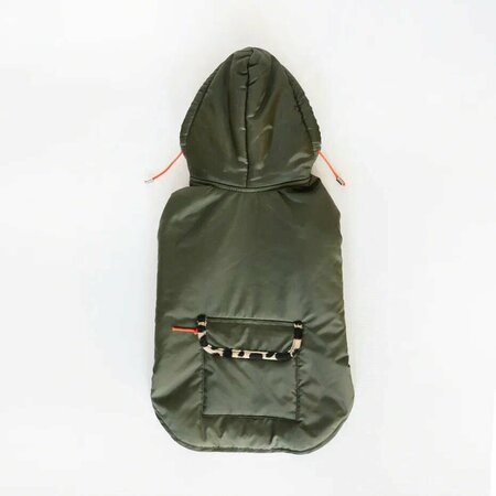 Пуховик для собак, представлен в размере 5. Изделие изготовлено из непромокаемой ткани зелёного цвета, отделка выполнена из искусственного меха с анималистическим принтом. На спинке расположено отверстие для поводка. Удобный капюшон защитит вашего питомца от дождя и снега. Произведено в США. Материалы: Полиэстер Размер: Обхват — 55–63,5 см Длина изделия — 46 см