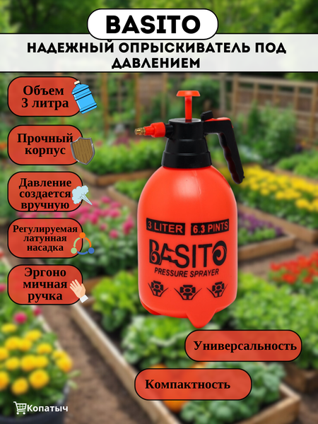 Инструкция Удобство использования: Эргономичный дизайн и легкий вес. Надежность: Прочная конструкция и долговечные материалы. Универсальность: Подходит для всех видов растений и обработок. Экономичность: Равномерное распыление минимизирует расход средств. Компактность: Легко хранить и транспортировать. Опрыскиватель Basito – ваш надежный помощник в саду и огороде! Опрыскиватель Basito – надежный помощник для ухода за садом и огородом! Опрыскиватель Basito – это удобное и практичное устройство для обработки растений жидкими средствами (удобрениями, пестицидами, биопрепаратами). Он идеально подходит для садоводов, огородников и дачников, которые ценят качество и комфорт в работе. Опрыскиватель Basito отличается прочной конструкцией, удобной системой управления и высокой производительностью. Он подходит для обработки деревьев, кустарников, грядок и газонов, обеспечивая равномерное распыление и экономичный расход средств. Меры предосторожности:- Используйте защитные перчатки и очки при работе с химическими средствами.- Храните опрыскиватель в сухом месте, защищенном от прямых солнечных лучей.- Не используйте для распыления легковоспламеняющихся веществ. С Basito уход за растениями становится проще и эффективнее!