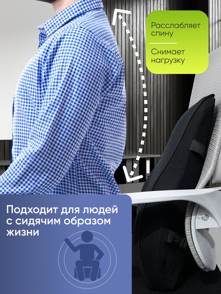 Подушка для поддержки поясницы при длительном сидении. Обеспечивает правильную осанку, снижает нагрузку на позвоночник и избавляет от боли в пояснице. Идеальна для офиса, автомобиля и дома. Поясничная боль, напряжение в спине, быстрая усталость от длительного сидения? Это знакомо каждому, кто проводит много времени в автомобиле, офисе или дома за компьютером. BACK COMFORT — это анатомическая подушка, разработанная с учётом физиологии позвоночника. Она плотно поддерживает поясничный отдел, разгружая мышцы и улучшая осанку. Изготовленная из высококачественного пенополиуретана с эффектом памяти (memory foam), подушка адаптируется к форме тела и возвращается в исходное положение после использования. Она создаёт ощущение мягкой, но уверенной поддержки, снижая нагрузку на позвоночник и улучшая кровообращение. Универсальное крепление позволяет легко установить подушку на любое кресло: автомобильное сиденье, офисное кресло, домашний стул. Чехол выполнен из дышащего 3D материала, который не перегревается и остаётся комфортным даже в жару.