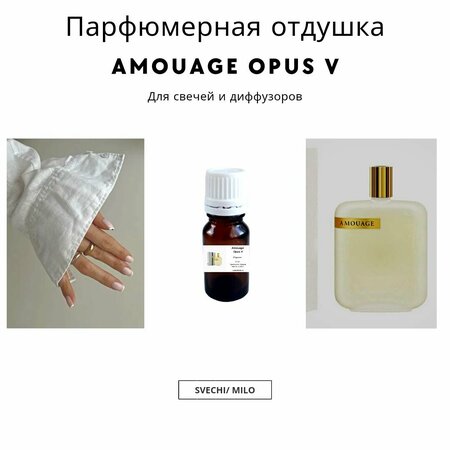 {"widgets":{"@card/UniversalPromoBadge":{"/content/page/fancyPage/defaultPage/universalPromoBadge":{"wrapperProps":{"margins":{"bottom":"3"}},"initialTime":1772261632870,"offerComposeId":"15625946644770538748"}}},"meta":{"/content/page/fancyPage/defaultPage/universalPromoBadge":{"name":"@card/UniversalPromoBadge"}},"collections":{"productServiceSnippets":{"15625946644770538748":{"productSnippet":{"snippetId":"document_id","type":"MODEL_CARD_LAYOUT","productPayload":{"snippetStyle":"NORMAL","title":{"value":"Парфюмерная отдушка Amouage Opus V 20 мл для свечей, мыла и диффузоров"},"badges":{},"price":{"actualPrice":{"amount":{"intPart":98247,"currency":"UZS"},"style":"RED","type":"OTHER_DISCOUNT"},"oldPrice":{"amount":{"intPart":158804,"currency":"UZS"},"style":"STRIKETHROWED"}},"signals":{"customsFee":{"text":{"text":"Возможна пошлина"}}},"gallery":{"mediaItems":[{"picture":{"baseUrl":"https://avatars.mds.yandex.net/get-mpic/12222123/2a0000018d6a4219b34542cf8d6df7c949a6/","width":1080,"height":1080,"title":"Парфюмерная отдушка Amouage Opus V 20 мл для свечей, мыла и диффузоров"},"type":"IMAGE"},{"picture":{"baseUrl":"https://avatars.mds.yandex.net/get-mpic/12420105/2a0000018d76113804b98a5fc3f5d01dba32/","width":1080,"height":1080,"title":"Парфюмерная отдушка Amouage Opus V 20 мл для свечей, мыла и диффузоров"},"type":"IMAGE"},{"picture":{"baseUrl":"https://avatars.mds.yandex.net/get-mpic/5241173/2a0000018e5d0137737f089bdcd179c9b251/","width":1080,"height":1080,"title":"Парфюмерная отдушка Amouage Opus V 20 мл для свечей, мыла и диффузоров"},"type":"IMAGE"}]},"wishlistButton":{"businessId":108797847,"mskuId":103260998982,"modelId":829962334,"oskuId":103260998982,"offerId":"Y6VE_MOrE5fqUFW3OzFWUw"}},"baobabPayload":{"type":"offer","wareId":"Y6VE_MOrE5fqUFW3OzFWUw","modelId":829962334,"marketSku":"103260998982","snippet_type":"product","isExpress":false,"price":158804,"additionalPrices":[{"priceType":"withDiscount","priceValue":98247},{"priceType":"unknown","priceValue":158804}],"hid":63619564,"shopId":431782,"shopSku":"op540","supplierId":108797844,"supplierType":3,"isUltima":false,"oskuId":103260998982,"snippetTheme":"GRID_FULL","stockCount":10,"promoLogJoinId":"d6d752f6d921df46203bb469e850643c/b9ebca0de629a39d"},"themeType":"GRID_FULL"}}}}}