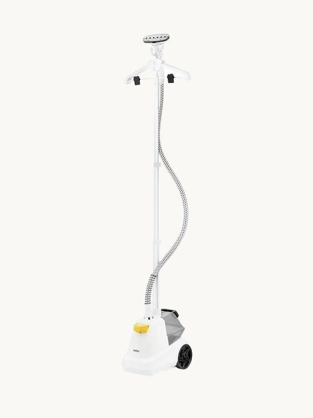 Корпус отпаривателя имеет напольное исполнение и оснащён колёсиками для удобного перемещения. Вы можете передвигать отпариватель, взявшись за телескопическую стойку.