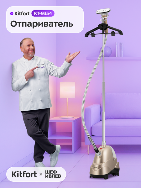 Лёгкий уход за одеждой! Отпариватель КТ-9354 справляется даже с капризными материалами, которые обычно не поддаются глажке. Пар не только разглаживает складки, но и дезинфицирует ваши вещи. Больше не нужно бояться испортить деликатные ткани! Отпаривание без хлопот Гладьте одежду любым удобным способом: на вешалке отпаривателя (с регулируемой стойкой), обычной вешалке или даже сушилке. Шторы обрабатывайте прямо на карнизе — не нужно снимать! Просто, быстро и без лишних движений. Педаль включения и съёмный резервуар Отпариватель создан для комфорта – педаль включения позволяет легко управлять устройством ногой, когда руки заняты одеждой. Съёмный резервуар для воды расположен над педалью и вмещает в себя 1,9 литров воды. Дополнительная насадка В комплекте идёт ворсовая щётка с зажимом, которая помогает фиксировать ткань во время обработки, аккуратно расправлять ворс на пальто, куртках и шерстяных изделиях. Ворс усиливает эффект чистки – с ним пар глубже проникает в ткань. Полный комплект Отпариватель КТ-9354 комплектуется защитной варежкой. Её рекомендуется надеть на руку, чтобы случайно не обжечься паром или о горячие поверхности.