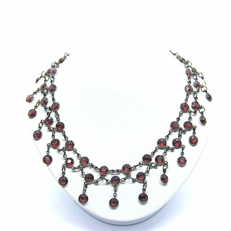 Ожерелье-браслет из металла с гранатовыми стеклянными подвесками Ожерелье-браслет выполнено из бижутерного сплава с отделкой чернением, что придает ему стильный и элегантный вид. Темно-красный цвет граната и геометрический дизайн делают украшение ярким и запоминающимся. Можно носить как колье или как браслет, что позволяет сочетать его с различными нарядами и аксессуарами. Длина ожерелья составляет 68 см, а ширина – 4 см, что обеспечивает комфортное ношение на протяжении всего дня. Застежка-крючок обеспечивает надежное крепление и позволяет легко надевать и снимать украшение. С цепочкой-удлинителем. Ожерелье-браслет произведено в Индии, что гарантирует высокое качество и ручную работу. Это украшение станет отличным подарком для подруги или девушки, подчеркнет вашу индивидуальность и добавит яркости в ваш образ. Ожерелье-браслет из металла с гранатовыми стеклянными подвесками – это стильное и оригинальное украшение, которое поможет создать неотразимый образ на вечеринке или празднике.