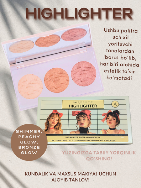 Wavemor Highlighter — палетка сияния для вашей кожи, 10 г Описание продукта Добавьте сияние и свежесть вашему макияжу с помощью Wavemor Highlighter — утончённого хайлайтера, созданного для тех, кто хочет блистать каждый день! Его лёгкая, шелковистая текстура мягко ложится на кожу, придавая ей эффект внутреннего свечения. Этот хайлайтер не создаёт жирного блеска — только естественное, утончённое сияние, которое делает кожу здоровой, отдохнувшей и ухоженной. Преимущества 15 преимуществ хайлайтера Wavemor Highlighter: ✨ Естественное сияние кожи — придаёт мягкий, “внутренний” блеск без жирного эффекта. Подходит для всех типов кожи — сухой, жирной, комбинированной и чувствительной. Шелковистая текстура — легко наносится, не оставляет пятен и полос. Обогащён витаминами и маслами — ухаживает за кожей, не пересушивает. Долговечный эффект — держится до 8–10 часов без потери яркости. Мелкодисперсные светоотражающие частицы — создают идеальный “soft glow” эффект. Многофункциональный продукт — можно использовать на лице, глазах и теле. Не забивает поры — позволяет коже дышать, подходит для ежедневного использования. Гипоаллергенная формула — без запаха, парабенов и искусственных красителей. Легко растушёвывается — даёт мягкий переход, без чётких линий. Подходит для фото- и видеосъёмки — эффектно смотрится под любым освещением. Экономичный расход — одной палетки хватает надолго. Придаёт коже ухоженный и свежий вид — даже без тонального крема. Идеален для любого макияжа — дневного, вечернего, праздничного. Стильная упаковка — компактная, лёгкая, удобна для косметички или путешествий. ✨ Натуральное свечение без жирного блеска. ✨ Подходит для всех типов кожи, включая чувствительную. ✨ Мелкодисперсные частицы равномерно рассеивают свет. ✨ Можно использовать на лице и теле. ✨ Держится до 8 часов, не осыпается, не скатывается. ✨ Ухаживает за кожей благодаря витамину E и натуральным маслам. ✨ Без запаха и парабенов. Кому подходит Девушкам, которые хотят добавить макияжу свежести; Женщинам, предпочитающим натуральный блеск; Профессиональным визажистам; Тем, кто ценит качество и натуральность. Состав Мика, тальк, минеральные пигменты, витамин E, масла жожоба и ши, микрокапсулы силикона. Не содержит парабенов и искусственных красителей. Способ применения Нанесите небольшое количество хайлайтера на скулы, переносицу или под брови. Растушуйте мягкими движениями. Наслаждайтесь естественным сиянием вашей кожи. Совет визажиста Используйте хайлайтер для акцентов на лице — он подчеркнёт вашу красоту и придаст макияжу выразительность. Подходит для фото- и видеосъёмки. Wavemor Highlighter — это не просто косметика. Это ваш свет, ваше настроение, ваша уверенность! Будьте в центре внимания, излучайте красоту и женственность с каждым штрихом. Wavemor — сияние, которое вы заслужили!
