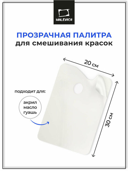 Палитра для смешивания красок Малевичъ из оргстекла прозрачная. Предназначена для масляных, темперных и акриловых красок. Гладкая поверхность палитры поддается чистке без усилий, что значительно сокращает время работы художника. Обернув такую палитру в стрейч пленку вы сможете и вовсе ее не чистить, а менять только пленку. Размер палитры: 20 х 30 х 0,3 см. Для безопасной транспортировки палитра Малевичъ с обеих сторон закрыта защитной пленкой, которую легко снять подцепив край пленки.