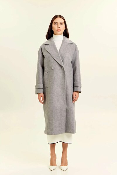 Пальто свободного силуэта с двубортной застёжкой сочетает в себе элегантность и удобство, делая его универсальным вариантом для холодного времени года. Модель выполнена из плотного материала, который отлично держит форму и защищает от прохлады. Спущенная линия плеча придаёт изделию современный акцент, а удлинённая длина ниже колена подчёркивает утончённость образа. Лаконичные прорезные карманы делают пальто практичным, а отложной воротник добавляет классическую строгость. Такое изделие легко комбинируется с офисными ансамблями и повседневными нарядами, сохраняя баланс между функциональностью и стилем.